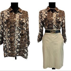 BROWN tan animal snake print button down shirt Sz L
