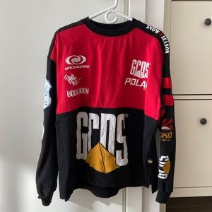 GCDS Black Crewneck Sweatshirt | Logo Graphic, Red Stripe Sleeve