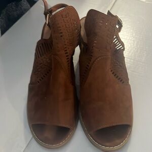 Open Toe Shoe Perforated wooden stack heel size 10 chestnut colour