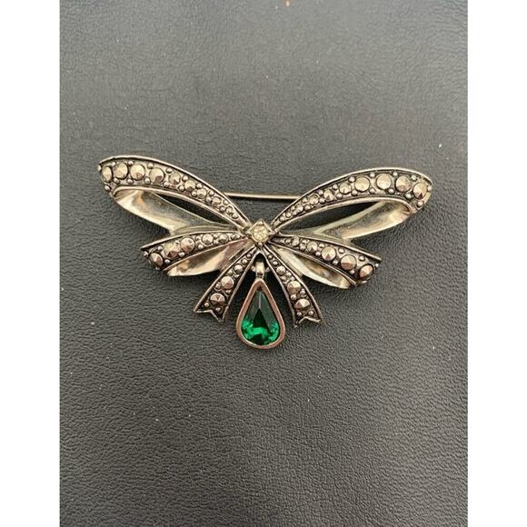 Beautiful silver-tone vintage Avon Bow brooch with a faux Emerald teardrop and Marcasite rhinestones.