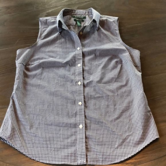Great black and white checked Ralph Lauren sleeveless shirt. Perfect for summer days and a dressy casual event. Fast shipping and careful packing. THANK YOU!
