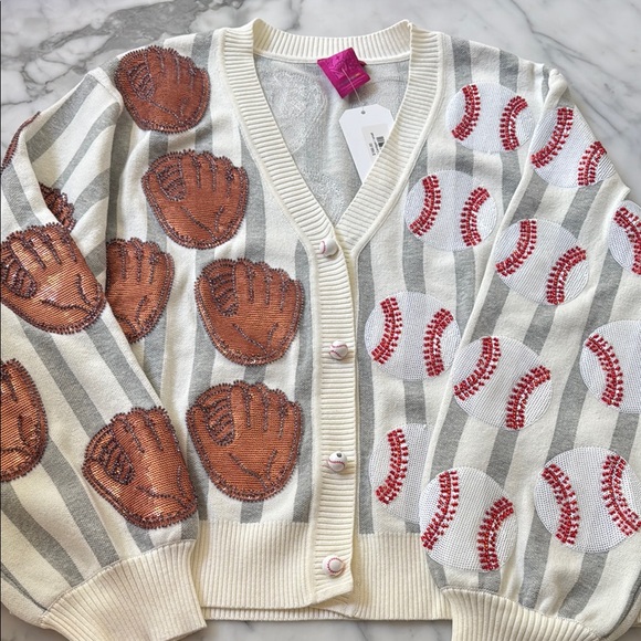 I'm obsessed with this QOS baseball-and-glove sequined, beaded cardigan—it's absolutely perfect. I’m counting down the days until I can rock it at a Detroit Lions game. Huge thanks ❤️