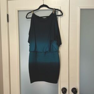 Cold shoulder short sleeve blue and teal dress by Xscape. Chain shoulder detail