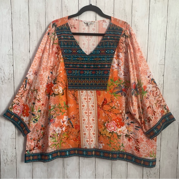This top is new, the colors are beautiful and shown accurately in the photo. The packaging was careful, shipping was fast, and the vendor was easy to contact.