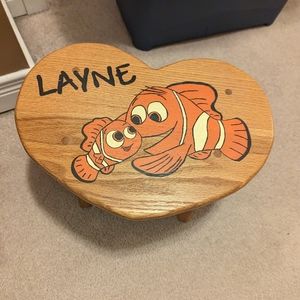 Wooden stool with name on it (Layne) can be sanded off and repainted