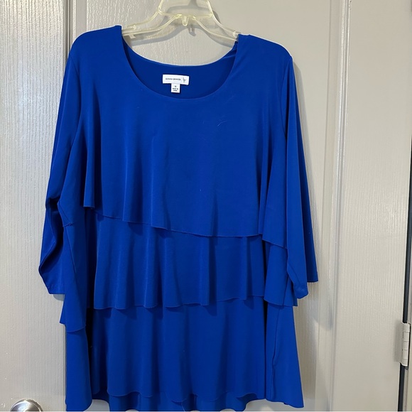 Item arrived as described. Packaged securely for safe shipping. The blouse is in good pre-owned condition. Love the layering ruffle style. Thank you.