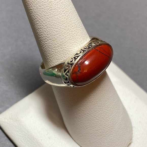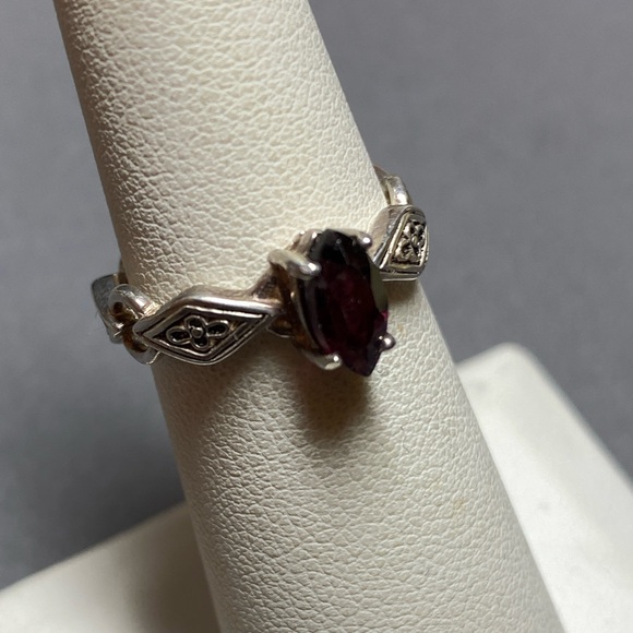 Gorgeous dainty vintage Avon sterling silver and Garnet ring. The ring is unusual in its design with circular links connecting sterling silver diamond shapes.