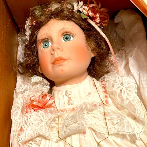 I receive this doll today and she is just as pictured and described!!! She is beautiful!! Wonderful seller and wonderful shipping in original box with love and care! Thank you!!