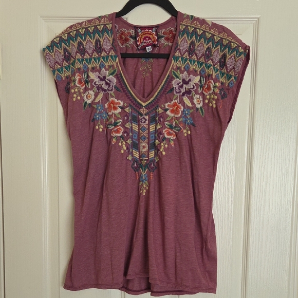 Gorgeous top for spring and summer! Very nice tone of berry purple, and I love the embroidery!