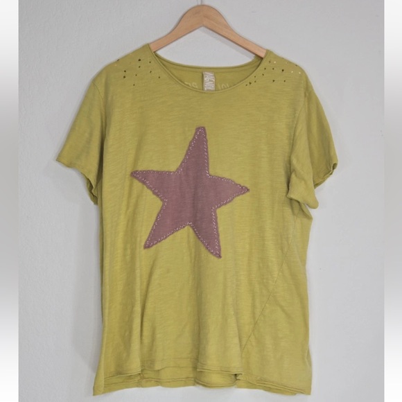 T-shirt as described and pictured. Oversized fit as expected. Really love the color and rough sewn star appliqué. Soft cotton crafted with love. Thank you!