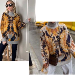 Zara gray mustard yellow abstract printed oversized turtleneck sweater Sz L NWOT