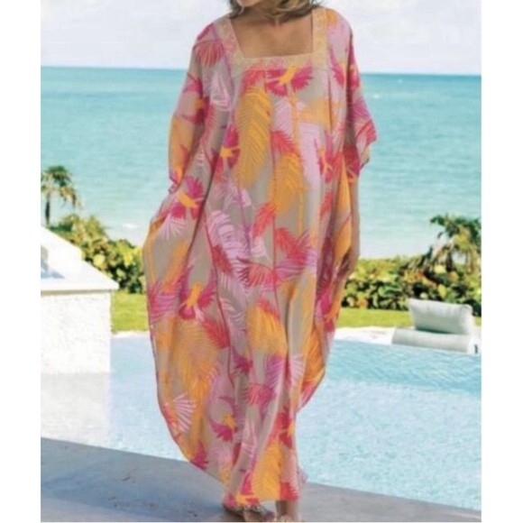 Just as described. Soft Surroundings women’s one size Tropical Bird Print Bahia Caftan. (I small stain on the front) Great price! Fast shipping!