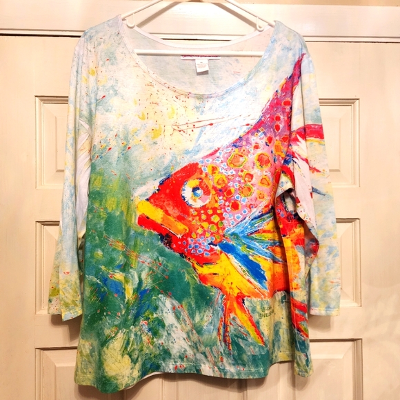 Leoma Lovegrave's clothing is like sunshine on fabric, they never fail to bring a smile and brighten the day. I own several pieces, but this may be my favorite, yet, so beautiful and vivid! Huge thanks to the seller for the great deal on this stunning shirt!