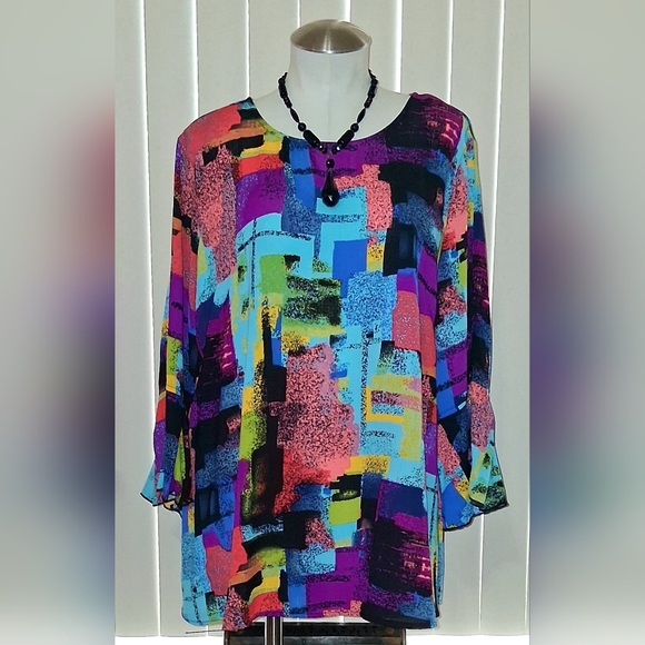 Today I received a beautiful multicolored abstract blouse. It was exactly as described, even prettier in person. It was sent very quickly and packaged very nicely. The seller was great to work with, and I would definitely purchase from her again.
