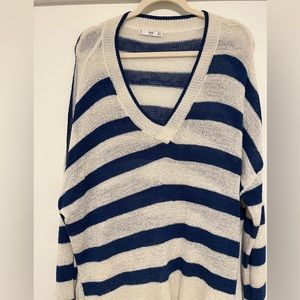 Nautical-Inspired Navy and Cream Striped V-Neck Sweater - Size M.