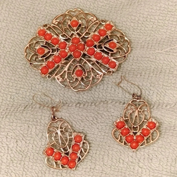 Lovely Sarah Coventry orange beaded brooch and earrings set.