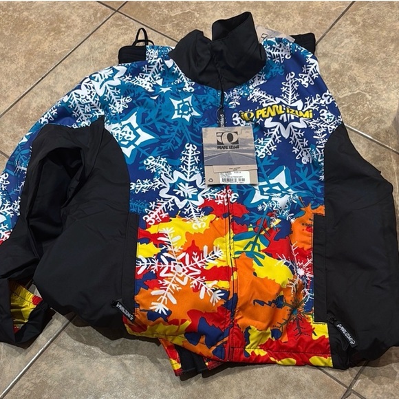 Dreaa019, An excellent, colorful (red, blue, white, yellow, black), L, Pearl Izumi bicycling jacket and pants. The jacket is roomy. The pants stretch enough to fit me. Thank you. MonaDatta1