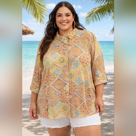 Very nice blouse. Nice spring colors. In very good condition. Quick shipping. Thank you!