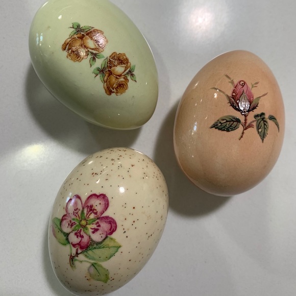 These charming porcelain eggs arrived in perfect condition because they were meticulously wrapped and sealed. Many, many thanks to the care of the very cordial seller!!💖💖💖💖💖 The thankfully strong outer package was quite a bit worse for the wear, but the extra wrapping meant everything inside was perfect. I am thrilled!!!