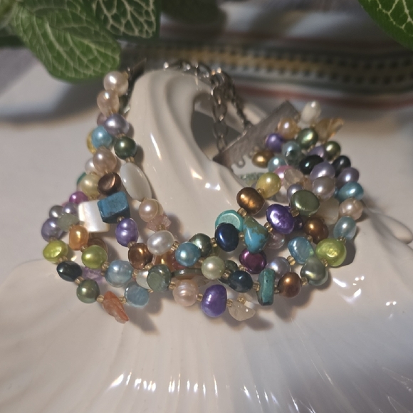 This is.an exquisitely designed multi color pearl bracelet.It is gorgeous .Has so.many beautiful colors will go with almost anything I wear.Love it!
