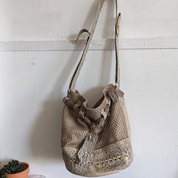 Neat bag! True bucket style. Love the leather interior and netting exterior.. nice snake detailing. Purchase seamless. Thank you!
