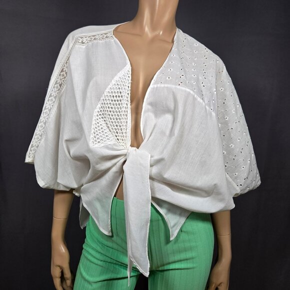 This cotton eyelet shrug is so pretty and really cute when on. I love the little white crocheted flowers on the side. Love my purchase! Shipping was very fast! 🤍🌼
