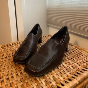 Buttery soft chocolate brown block kitten heel leather loafers - size 8