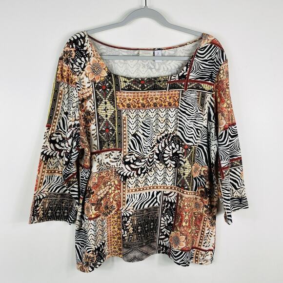 My Chico's square neck print top arrived securely today in a soft plastic envelope. I really like this top a lot. It will goes quite nicely with a pair of camel colored joggers pants that I already had. The item cost and its shipping were very reasonable. Glad I made this purchase.