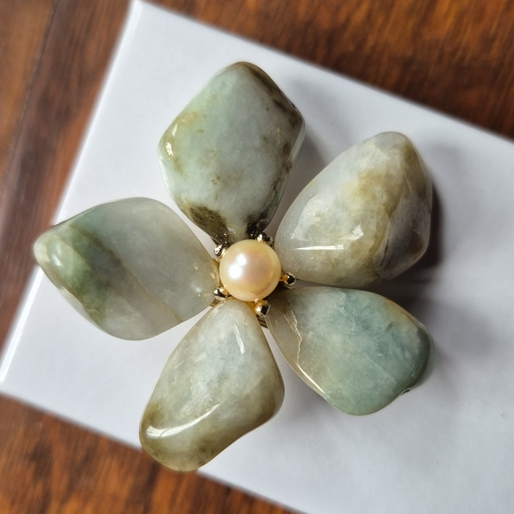 I love this brooch. The vintage design of the Swoboda Jade flower topped off by a beautiful pearl is exceptional.
