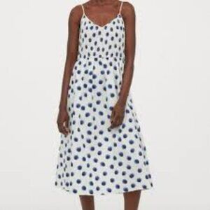H&M White with Blue Dots Summer Dress Smocked Top 100% Cotton Full Skirt Size L
