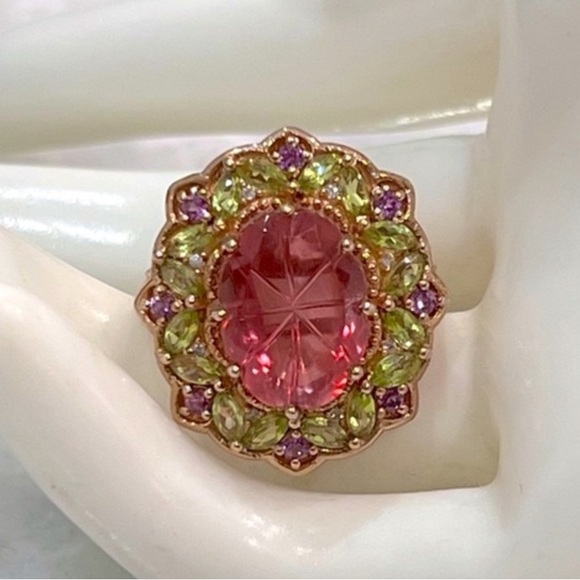 Fantastic floral designed sterling silver rose gold overlay ring with Salmon Quartz, Peridots and Rhodonite Garnets. Amazing