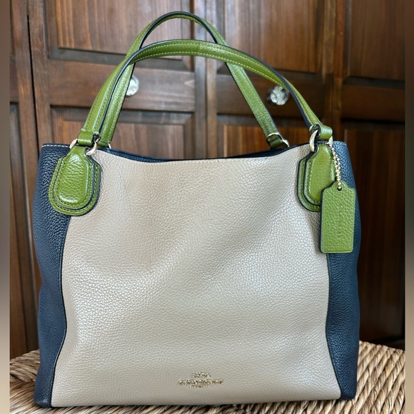 This purse is exactly as described!! I LOVE this bag!!! It is so perfect!! I will say that I did read the description that says it is taupe and blue but the pictture is what stuck in my mind. The picture looks white or off white. That is what I thought it was so I was a little surprised at first and that is on me not the seller. In the end, I love it even more that it is not white!!!