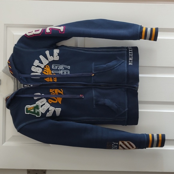 I was worried that the XS would be a tad too small, but it fits perfectly! It’s fitted, but still has room in the back and waist area. The arms don’t feel tight and I can easily lift them up without the cuffs pulling back. It’s in really, really good condition especially for a vintage Aero hoodie (like, have you seen what’s out there…?) and for an amazing price point! I’m very satisfied with my purchase. Thank you very much for the fast shipping as well!!