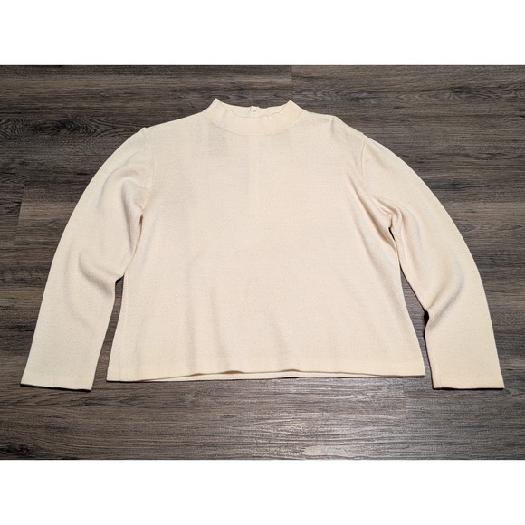 I am SO pleased to have found this ivory colored long sleeve St. John Knit sweater. It has been plugged into my online search efforts on all platforms so imagine my delight in finding this “unicorn.” It arrived in perfect condition as a gently used garment, clean, exactly as described, and delivered on time. I am one very happy customer.