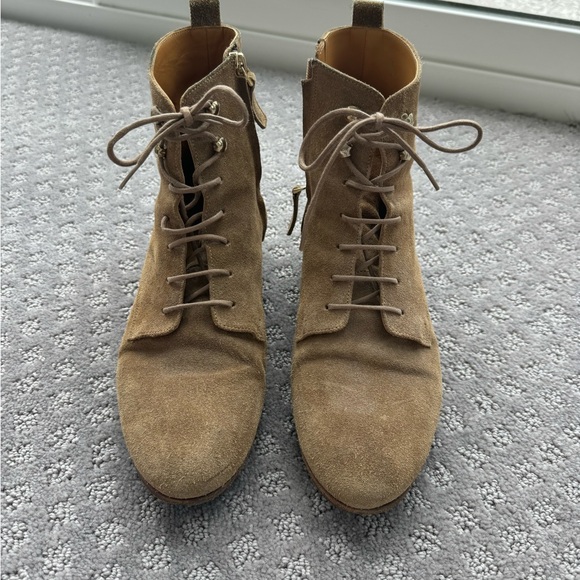 These suede Sezane lace up boots arrived on time and in great condition. I may not always be a fan of the girliness of Sezane's clothing, but their shoes are unfailing well-made and comfortable. Can't afford them new and can barely afford them second-hand, so it's a special pleasure to find these. I appreciate your posting them.