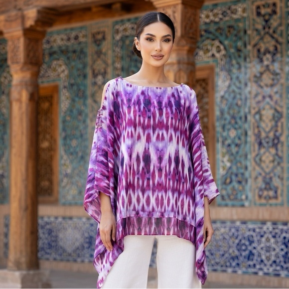 Beautiful Chico’s Fuschia Ikat Print Tunic has a chic draped handkerchief style at a great price! Double wrapped, perfect condition. Lightning fast delivery.
