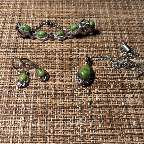 Amazing silver and green turquoise jewelry set. The design of the necklace, bracelet, and earrings is beautiful.