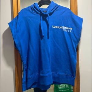 A sleeveless bright blue hoodie with slit on each side. 90s style