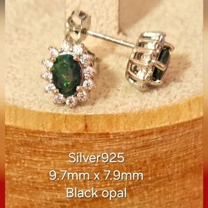 Black opal stud earring with moissanite clusters halo in Sterling silver setting