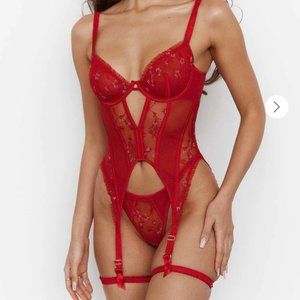 BNWT Gia Intimates Maroon Red Lingerie Set Basque, Thong, & Garters Size S & M