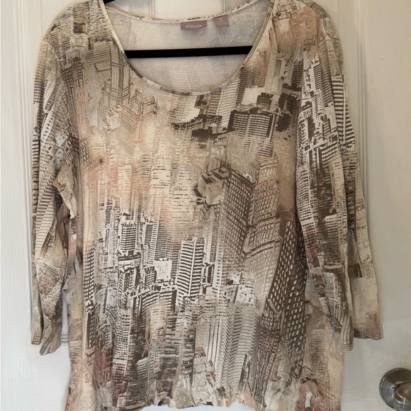 My Chico's beige and brown cityscape women's top arrived securely today in a soft plastic envelope. It is a very nice top. One I am sure I will enjoy wearing. The top is exactly as described on the website. The cost of the top and the cost to ship it were reasonable. Glad I made this purchase.