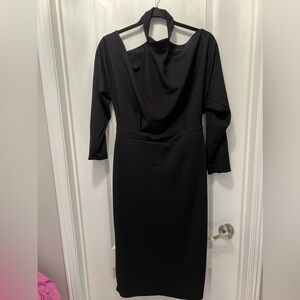 Black dress with neck detail, and low zipper back.