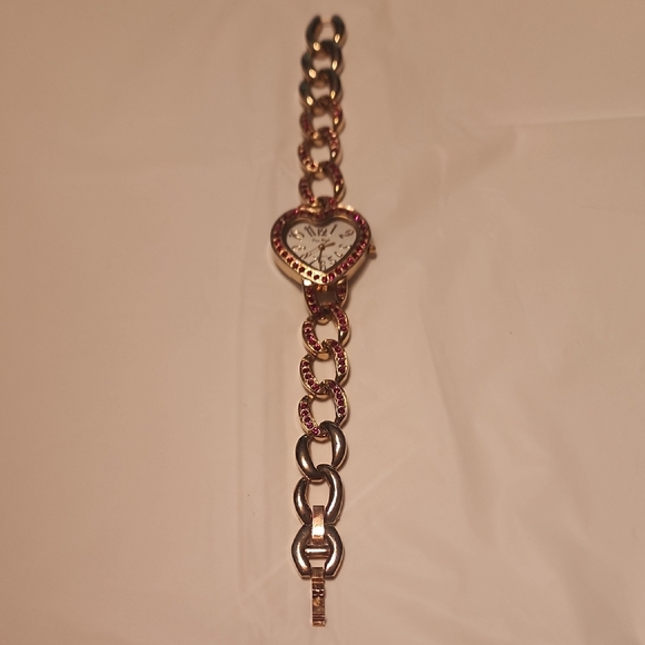 Came in a timely manner and was packaged very nicely. The stones look to be more red than pink but it’s still a very cute watch and was in perfect condition! The extra little gift was also sweet, thank you
