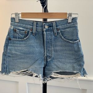 Levi’s 501 jeans with darker denim seam and ripped details, size 25