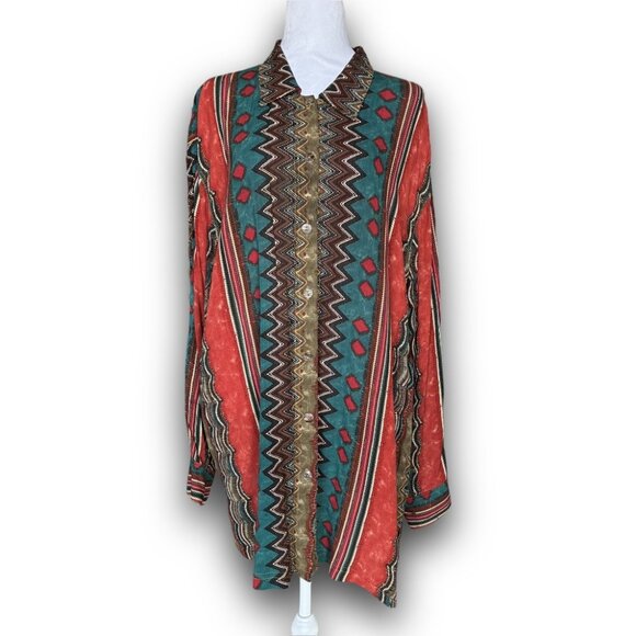 Girl, this is a fabulous top. You know God rest my mother so she used to wear Carol Little styles all the time. I don’t believe the line of clothes are still available to buy, but everything is so classy and my mom used to wear all her clothes and now I’m wearing them all these years later this shirt fits me beautiful. I opened it up and wear it like a kimono and I put a black shirt or a shirt underneath it so when you walk it flares out when you walk it looks beautiful. I’m wearing it today. I just opened it up. It looks fantastic. I love this. It’s so cool. The colors are great thank you