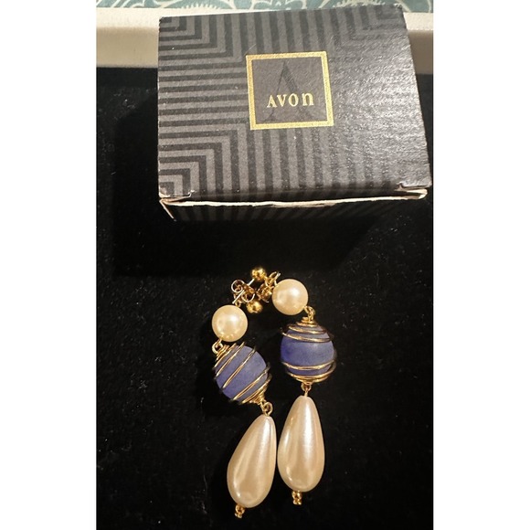 Exquisite vintage 1993 Avon drop earrings with faux pearls and blue beads. Gorgeous!