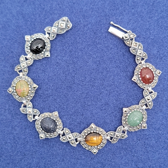 This vintage sterling silver Egyptian Revival Scarab carved gemstones bracelet is amazing. Love it!