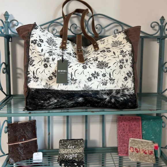 Arrived early and I LOVE it! The floral with this particular black and white cow hide looks SO GOOD! It is truly a stunning bag. Very well packaged. TY!!!