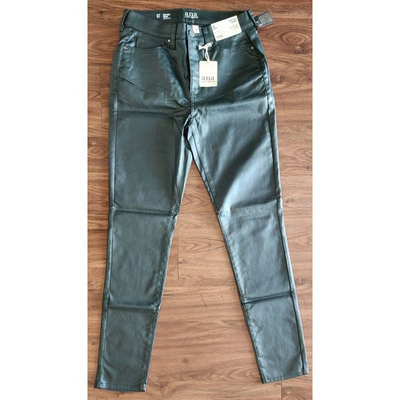 Before buying these a.n.a. 6 tall faux leather high rise jeans, I checked out other online listings. Had low expectations, but finally decided to give these a try for $26.49. The unusual faux leather denim keeps these smooth, and they fit me perfectly (5'9", 135 lbs).