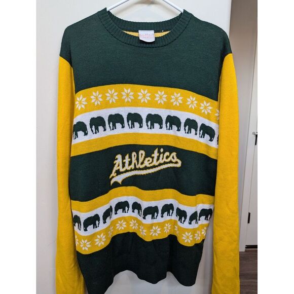 OMG! I am in love!! I've been trying to find this sweater w/the elephants for a like a decade since Matt Vasgersian wore it on MLB Network. They had them at the Coliseum once but everytime they had sweaters after that they didn't have the elephants! This is AmAzing! It's so soft & comfy & for a L it fits me (a pretty petite chick) fairly well! I am so happy & the delivery was lightening fast!!! Thank you sooooo much!!! 💚💛🐘⚾️💚💛
